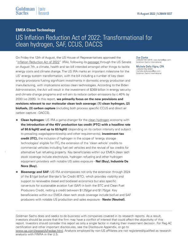 【Goldman Sachs】【20220815】US Inflation Reduction Act of 2022 Transformational for clean hydrogen, SAF, CCUS, DACCS-18页