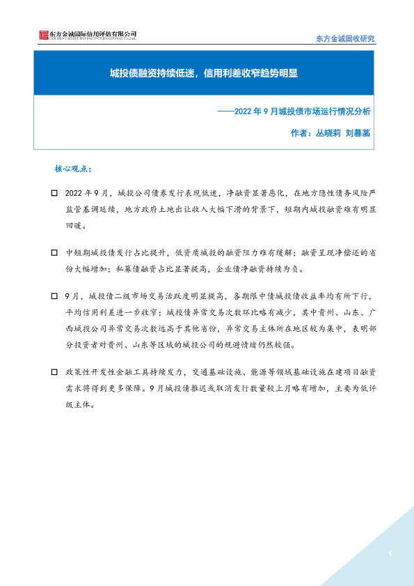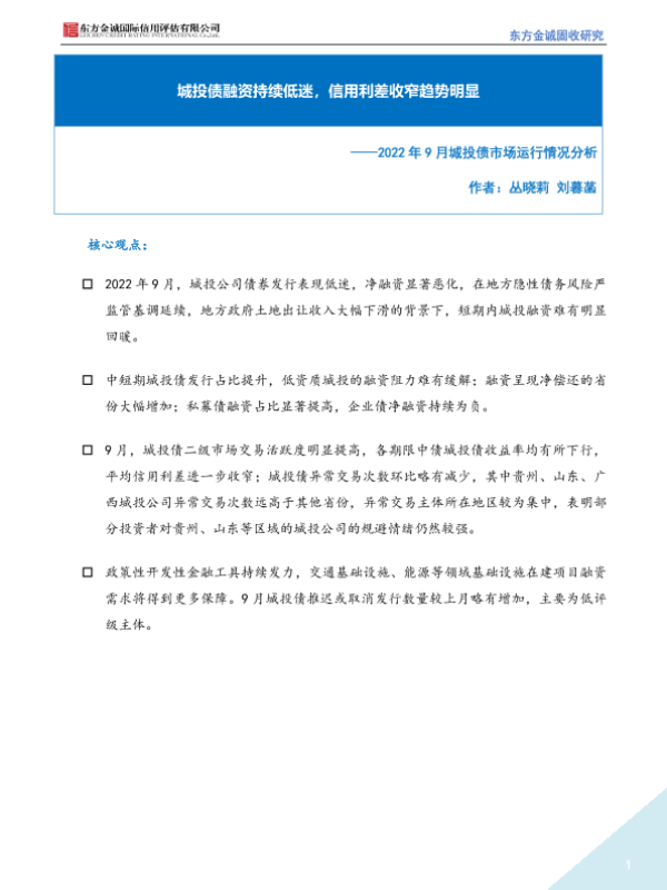 【东方金诚】【20221020】2022年9月城投债市场运行情况分析报告:城投债融资持续低迷,信用利差收窄趋势明显-15页