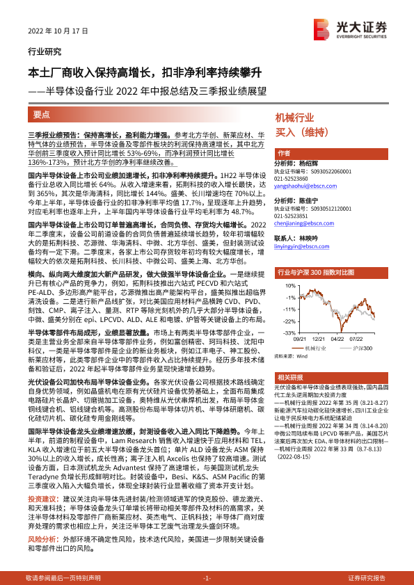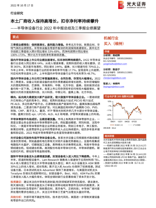 【光大证券】【20221017】半导体设备行业2022年中报总结及三季报业绩展望:本土厂商收入保持高增长,扣非净利率持续攀升-21页