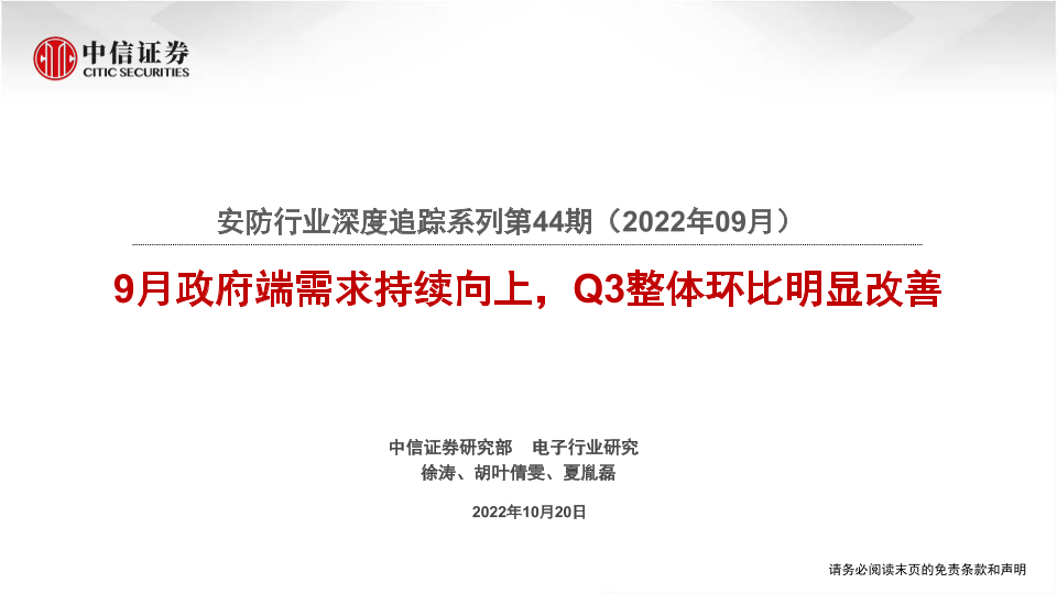 【中信证券】【20221020】安防行业深度追踪系列第44期(2022年09月):9月政府端需求持续向上,Q3整体环比明显改善-19页
