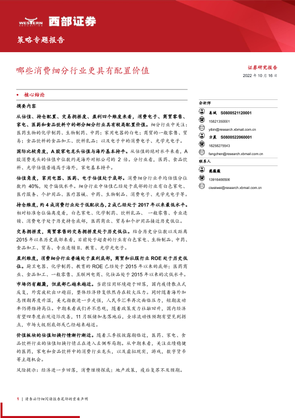 【西部证券】【20221016】策略专题报告:哪些消费细分行业更具有配置价值-15页