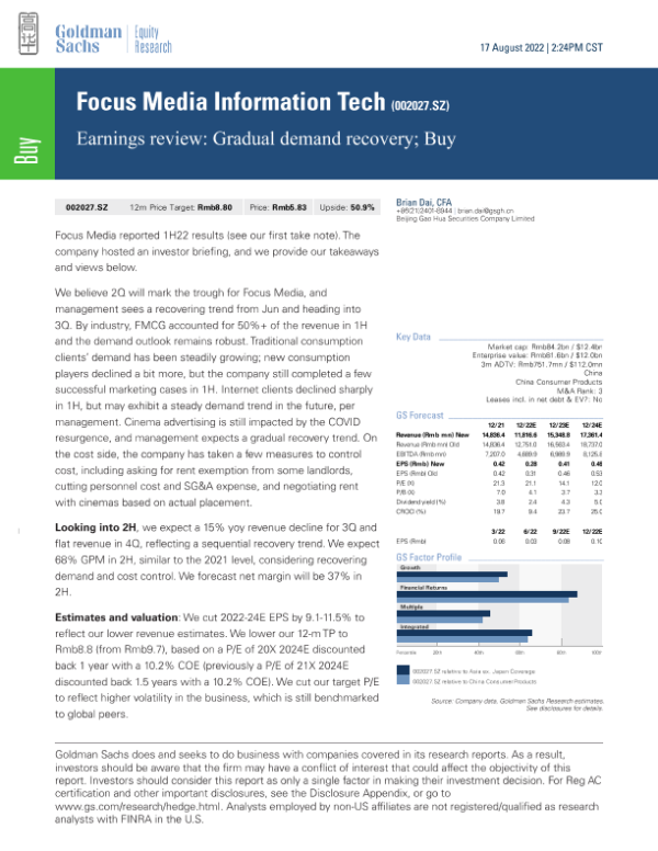 【Goldman Sachs】【20220817】Formation Tech (002027.SZ) 财务回顾:需求逐渐恢复;买入-9页