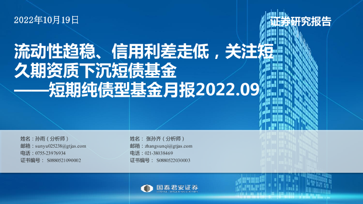 【国泰君安证券】【20221019】短期纯债基金月报(2022年9月):流动性趋稳、信用利差走低,关注短久期资质下沉短债基金-16页