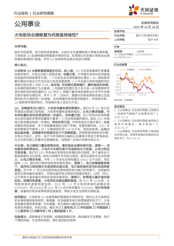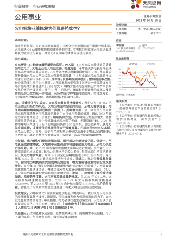 【天风证券】【20221017】公用事业行业研究周报:火电板块业绩修复为何具备持续性?-17页