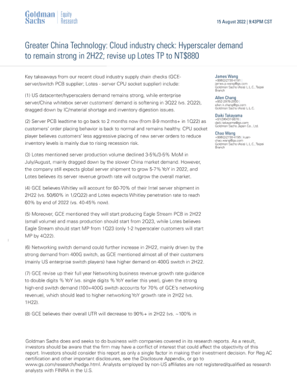 【Goldman Sachs】【20220815】Hyperscaler demand to remain strong in 2H22; revise up Lotes TP to NT$880-9页