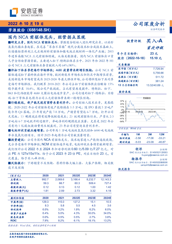 【安信证券】【20221019】国内NCA前驱体龙头,经营拐点显现-34页