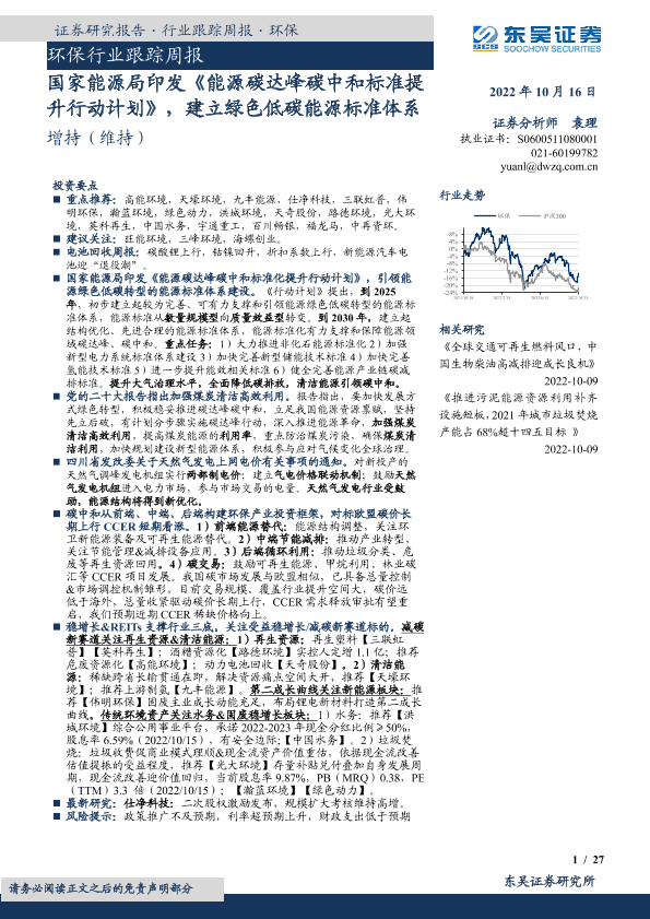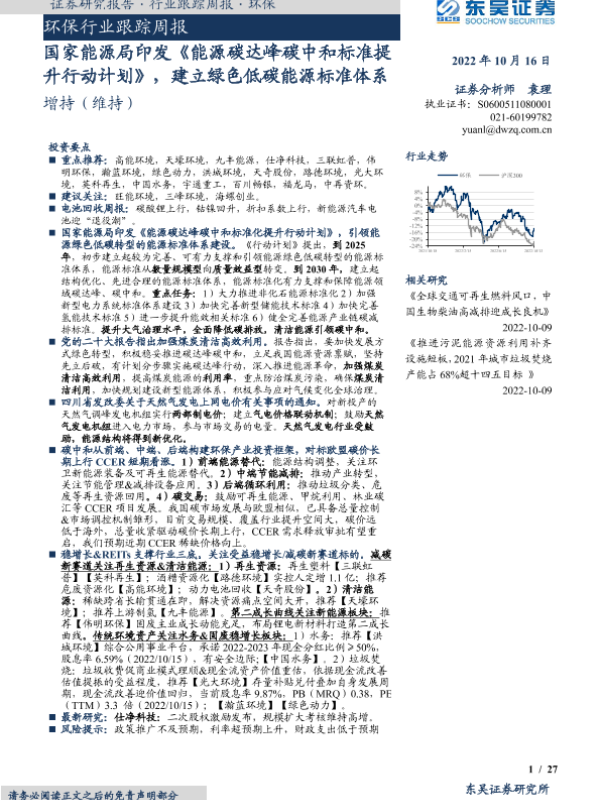 【东吴证券】【20221016】环保行业跟踪周报:国家能源局印发《能源碳达峰碳中和标准提升行动计划》,建立绿色低碳能源标准体系-27页
