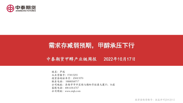 【中泰期货】【20221017】甲醇产业链周报:需求存减弱预期,甲醇承压下行-24页