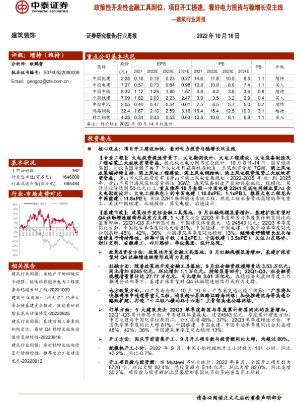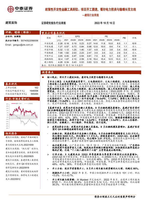 【中泰证券】【20221016】建筑行业周报:政策性开发性金融工具到位、项目开工提速,看好电力投资与稳增长双主线-23页