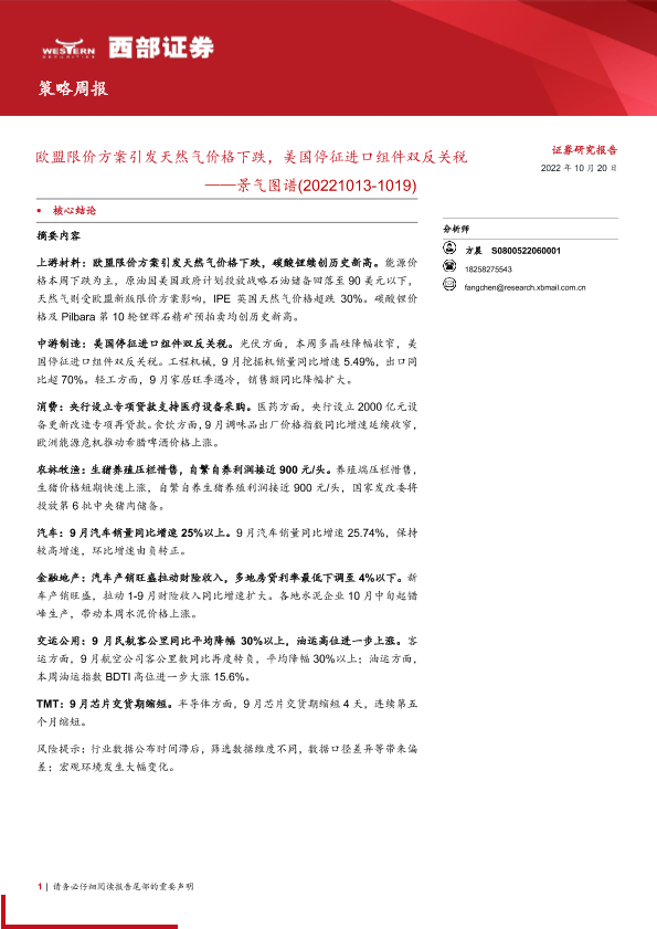 【西部证券】【20221020】景气图谱:欧盟限价方案引发天然气价格下跌,美国停征进口组件双反关税-34页