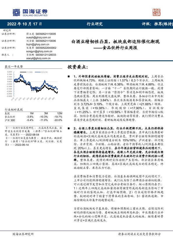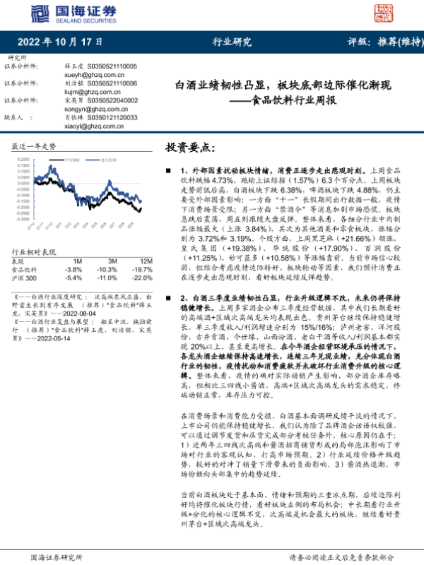 【国海证券】【20221017】食品饮料行业周报:白酒业绩韧性凸显,板块底部边际催化渐现-20页