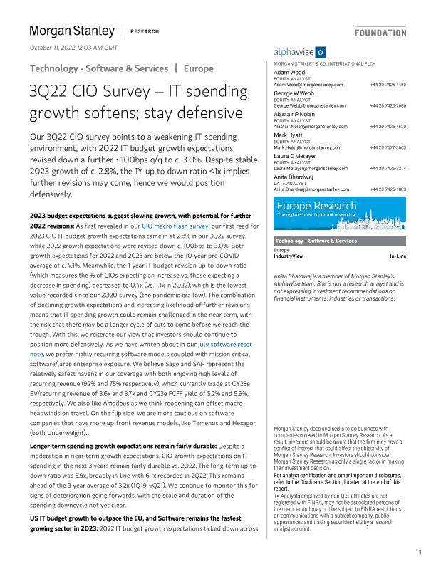 【Morgan Stanley】【20221011】3Q22 CIO Survey – IT spending growth softens; stay defensive-22页