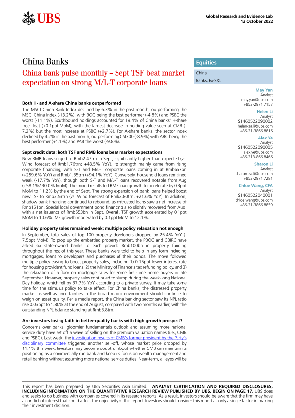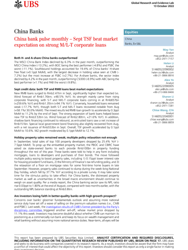 【UBS Securities Asia Limited】【20221013】China bank pulse monthly – Sept TSF beat market expectation on strong M/L-T corporate loans-26页