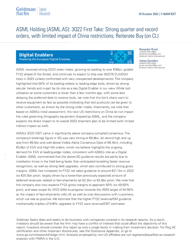 【Goldman Sachs】【20221019】ASML Holding(ASML.AS) 3Q22 First Take Strong quarter and record orders, with limited impact of China restrictions; Reiterate Buy-9页