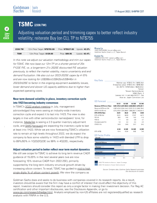【Goldman Sachs】【20220817】调整估值方法和资本支出以更好地反映行业波动;重申买入(在CL), TP至NT$755-10页