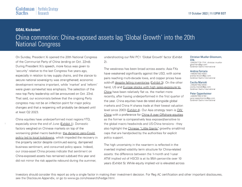 【Goldman Sachs】【20221017】China-exposed assets lag 'Global Growth' into the 20th National Congress-30页