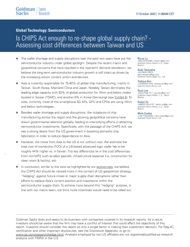 【Goldman Sachs】【20221017】Is CHIPS Act enough to re-shape global supply chain?-Assessing cost differences between Taiwan and US-26页