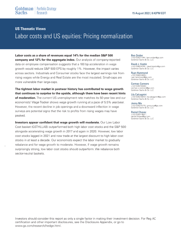 【Goldman Sachs】【20220815】US Thematic Views Labor costs and US equities - Pricing normalization-18页