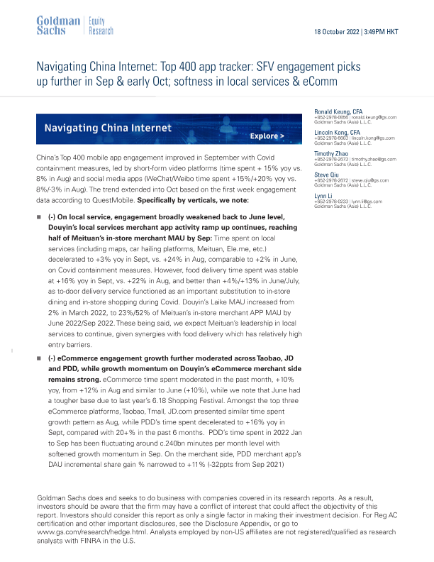 【Goldman Sachs】【20221018】Top 400 app tracker SFV engagement picks up further in Sep & early Oct; softness in local services & eComm-20页