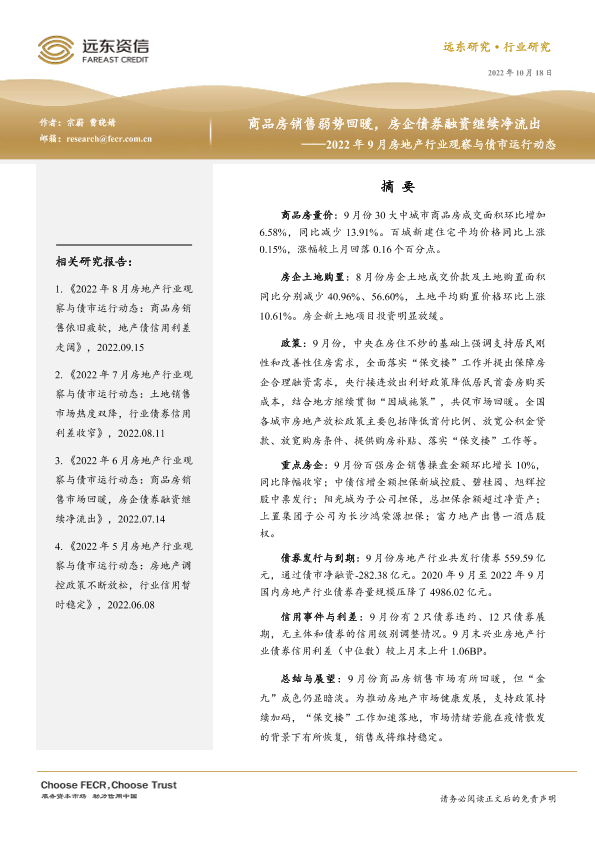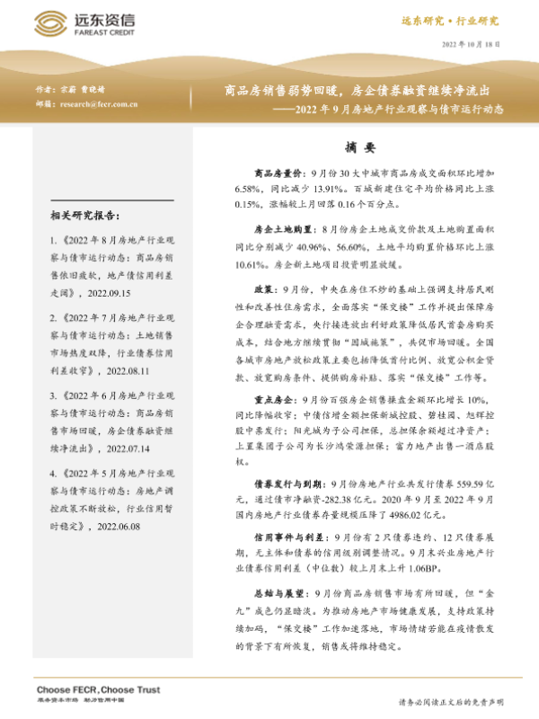 【远东资信】【20221018】2022年9月房地产行业观察与债市运行动态:商品房销售弱势回暖,房企债券融资继续净流出-17页