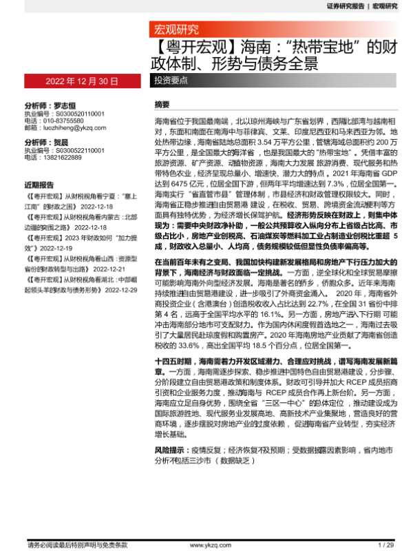 【粤开证券】【20221230】海南:“热带宝地”的财政体制、形势与债务全景-29页