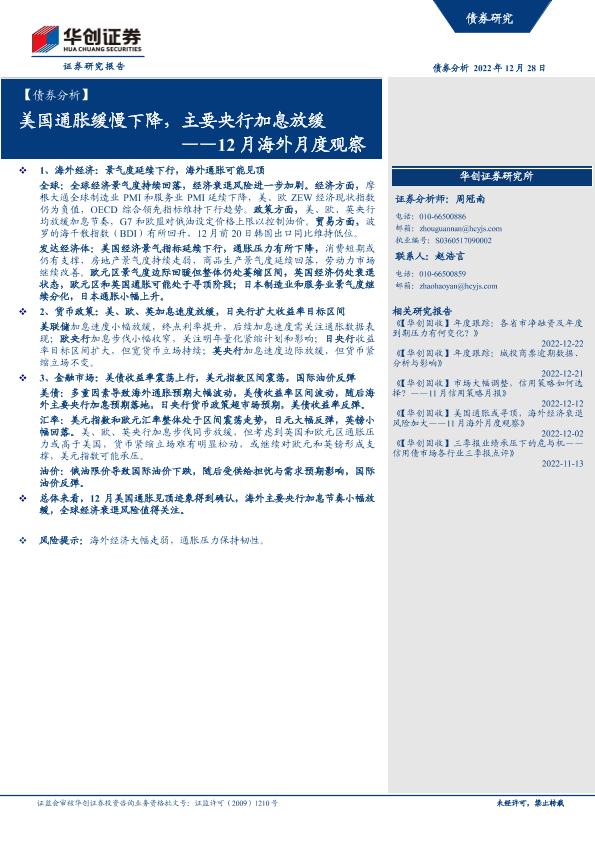 【华创证券】【20221228】【债券分析】12月海外月度观察:美国通胀缓慢下降,主要央行加息放缓-20页