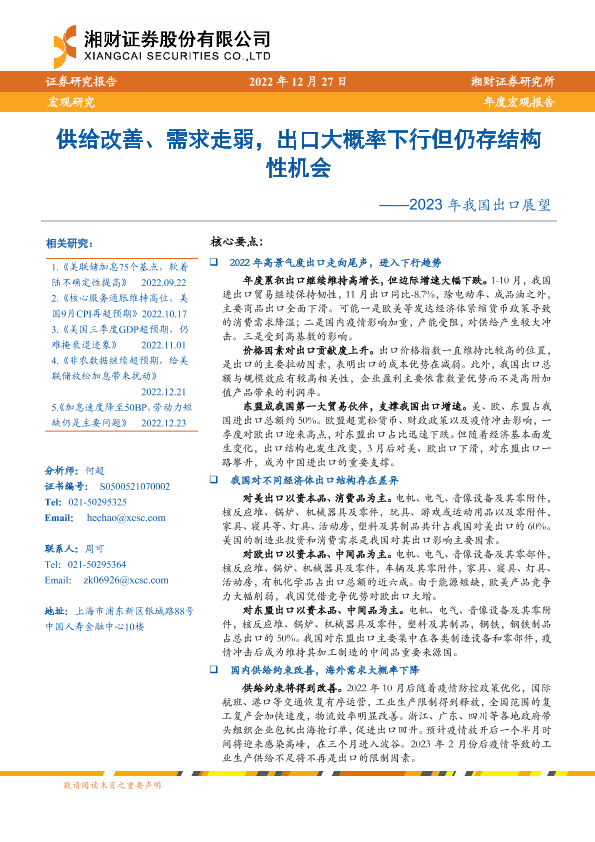 【湘财证券】【20221227】2023年我国出口展望:供给改善、需求走弱,出口大概率下行但仍存结构性机会-20页