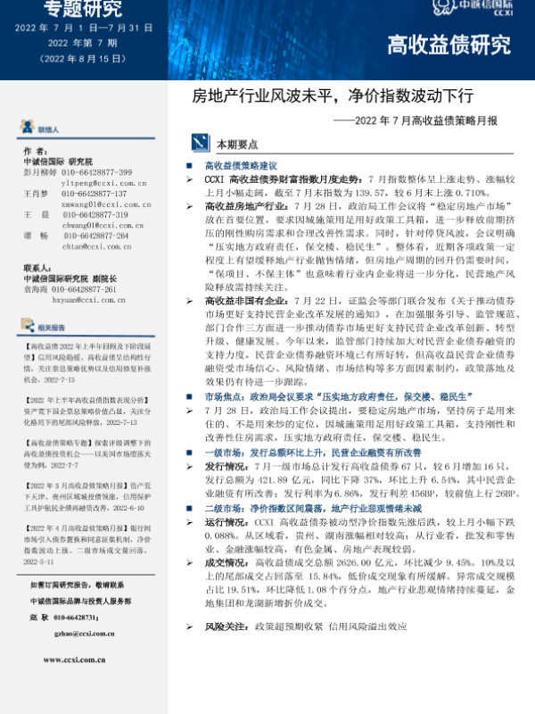 【中诚信国际】【20220713】中诚信-【2022年7月高收益债策略月报】房地产行业风波未平,净价指数波动下行-14页