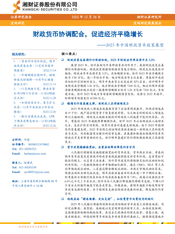 【湘财证券】【20221226】2023年中国财政货币政策展望:财政货币协调配合,促进经济平稳增长-26页