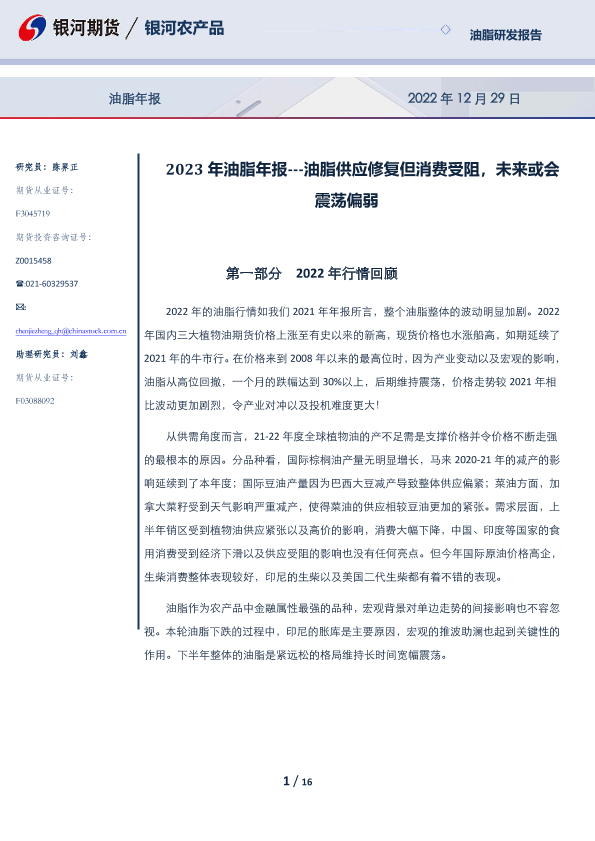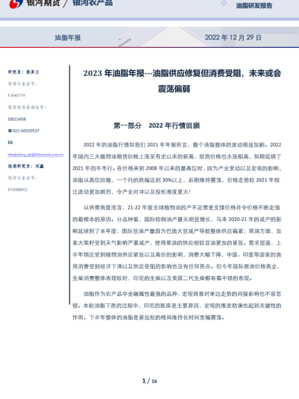 【银河期货】【20221229】2023年油脂年报:油脂供应修复但消费受阻,未来或会震荡偏弱-16页