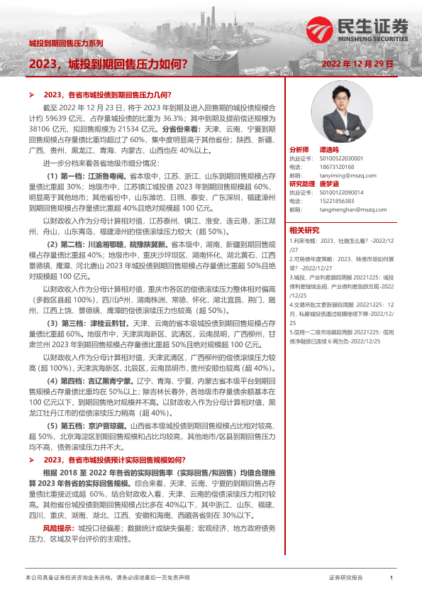 【民生证券】【20221229】城投到期回售压力系列:2023,城投到期回售压力如何?-23页