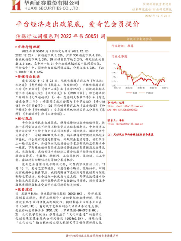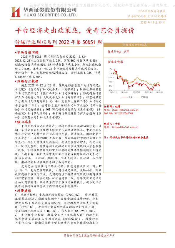 【华西证券】【20221225】传媒行业周报系列2022年第50&51周:平台经济走出政策底,爱奇艺会员提价-40页