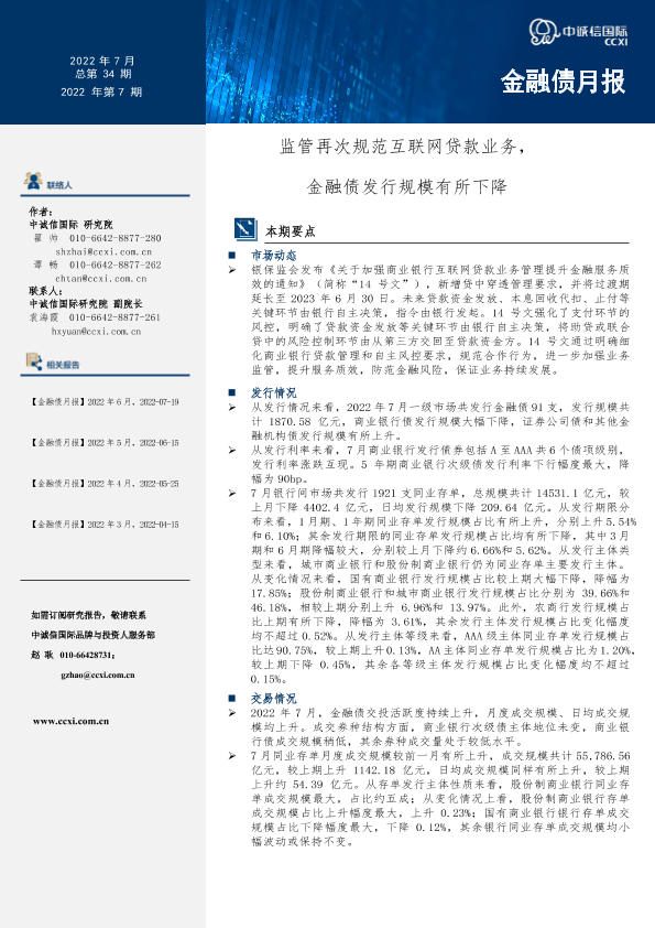 【中诚信国际】【20220719】中诚信-【金融债月报】2022年7月-监管再次规范互联网贷款业务,金融债发行规模有所下降-12页