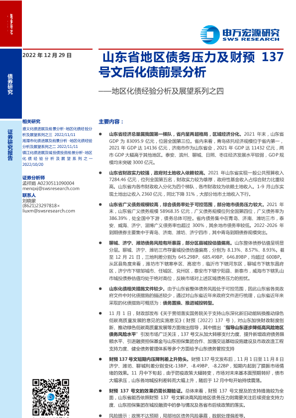 【申万宏源】【20221229】地区化债经验分析及展望系列之四:山东省地区债务压力及财预137号文后化债前景分析-22页