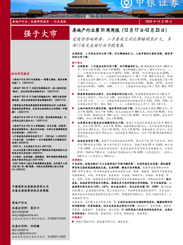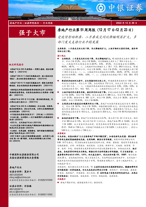 【中银证券】【20221226】房地产行业第51周周报:受疫情影响新房、二手房成交同比降幅明显扩大,多部门发文支持行业平稳发展-32页