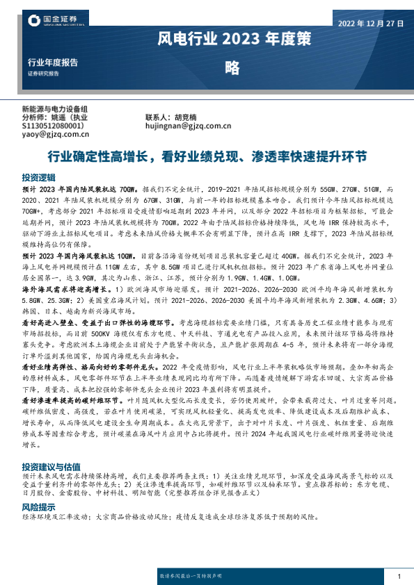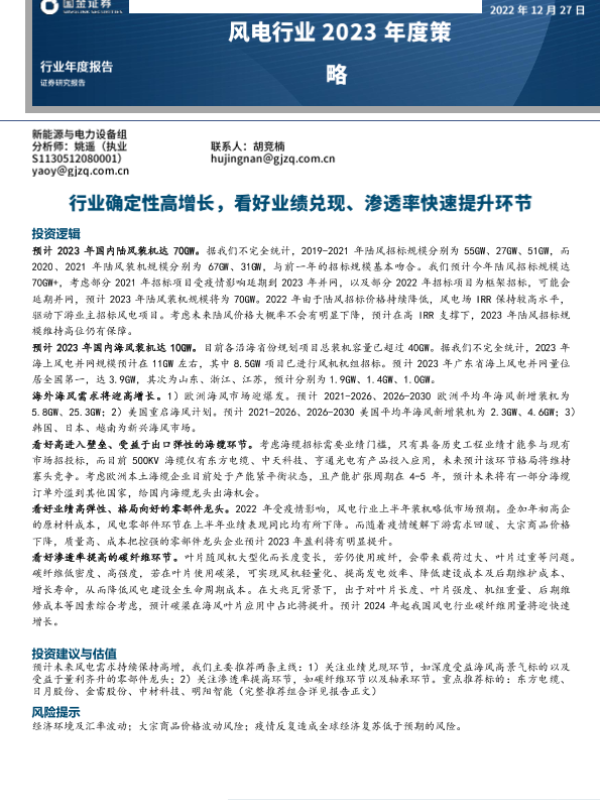 【国金证券】【20221227】风电行业2023年度策略:行业确定性高增长,看好业绩兑现、渗透率快速提升环节-23页