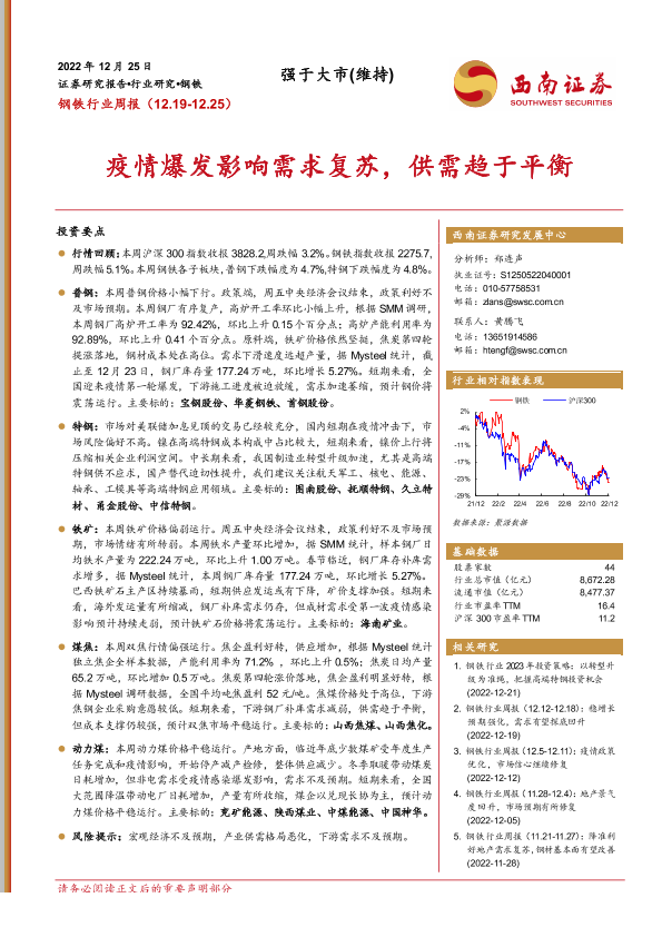 【西南证券】【20221225】钢铁行业周报:疫情爆发影响需求复苏,供需趋于平衡-16页
