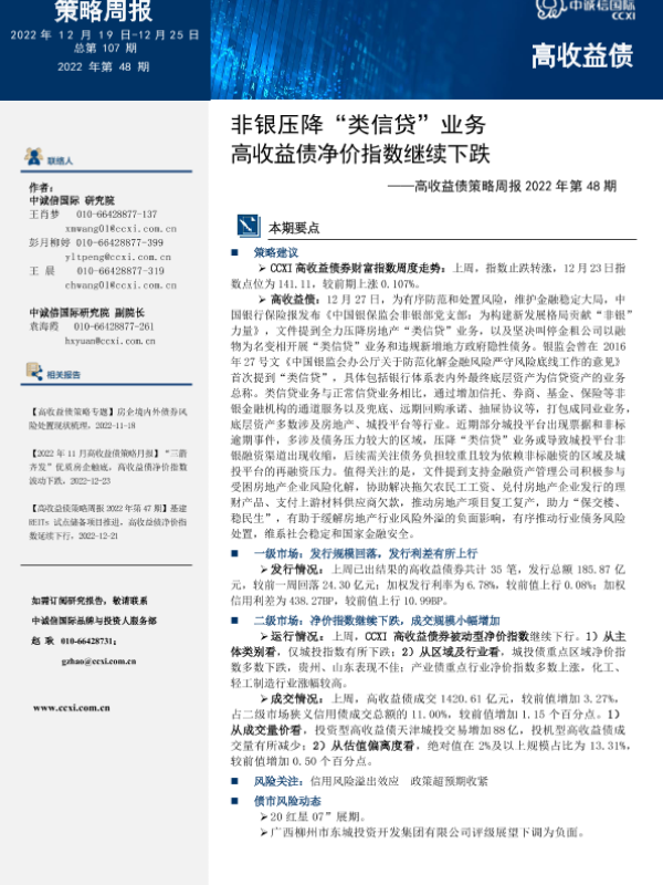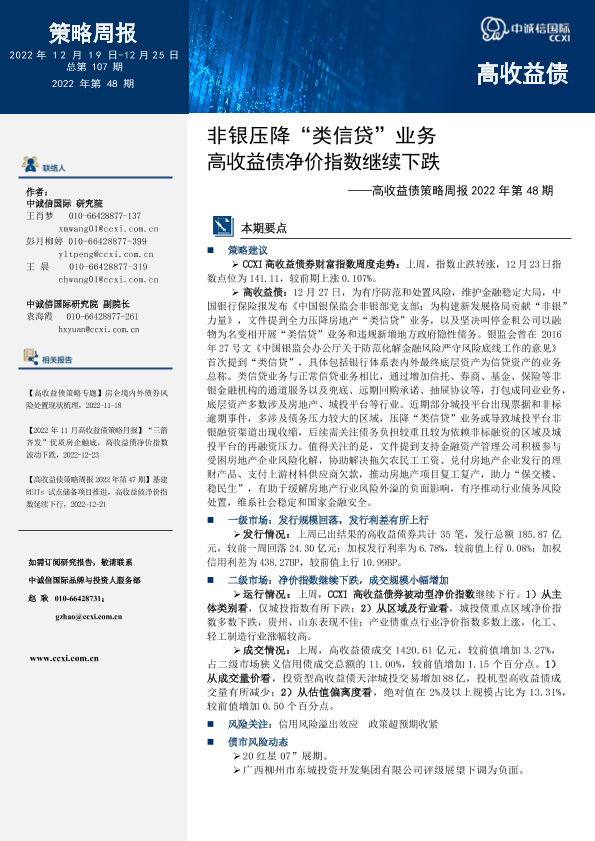 【中诚信国际】【20221225】高收益债策略周报2022年第48期:非银压降“类信贷”业务,高收益债净价指数继续下跌-16页