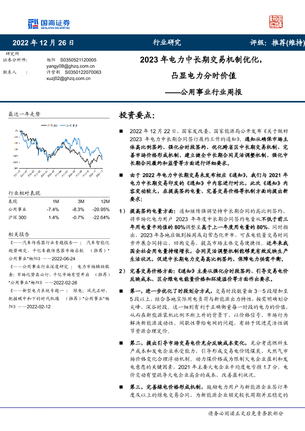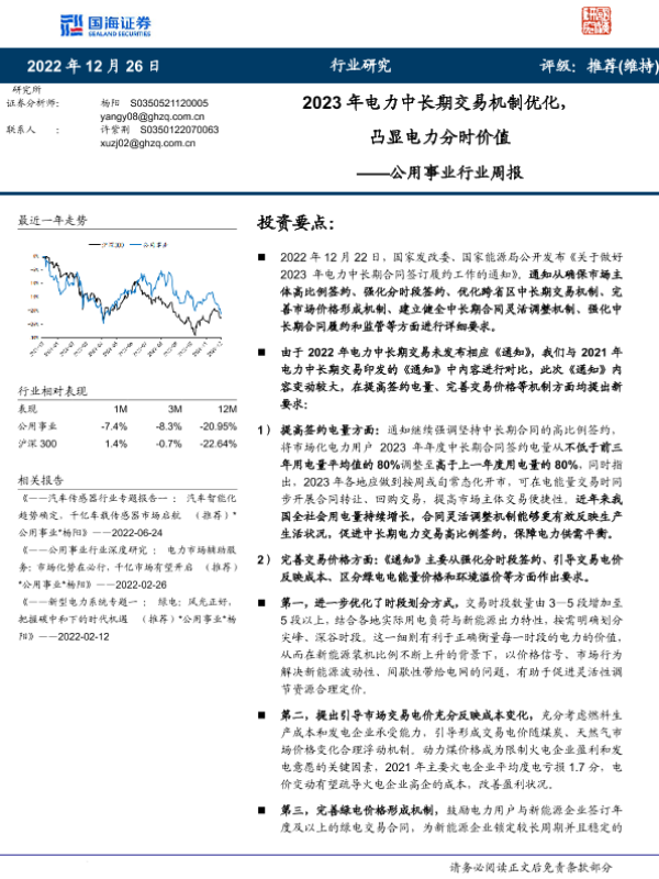 【国海证券】【20221226】2023年电力中长期交易机制优化,凸显电力分时价值——公用事业行业周报-20页