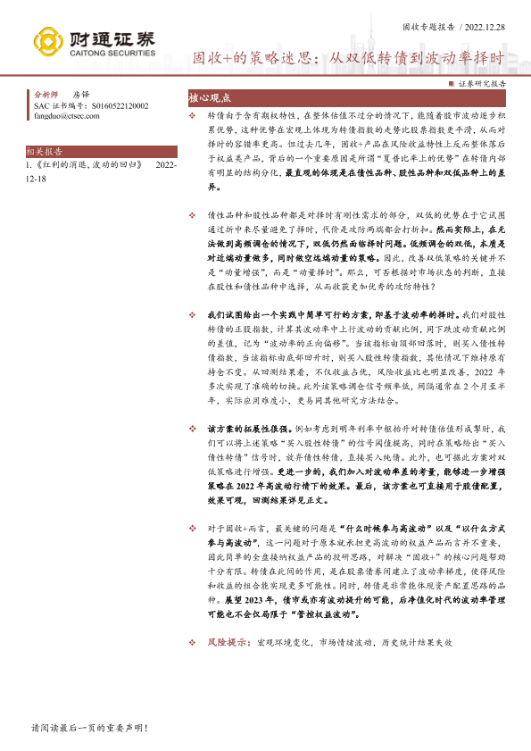 【财通证券】【20221228】固收+的策略迷思:从双低转债到波动率择时-15页