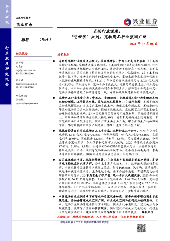 【兴业证券】【20210706】宠物行业深度: “它经济”兴起,宠物用品行业空间广阔-40页