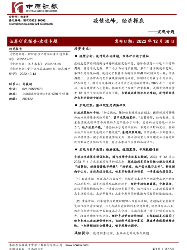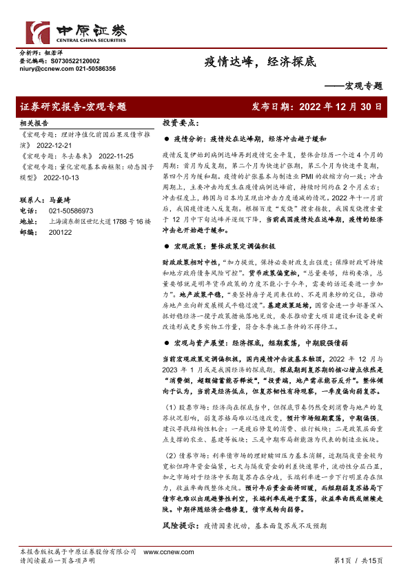 【中原证券】【20221230】宏观专题:疫情达峰,经济探底-15页