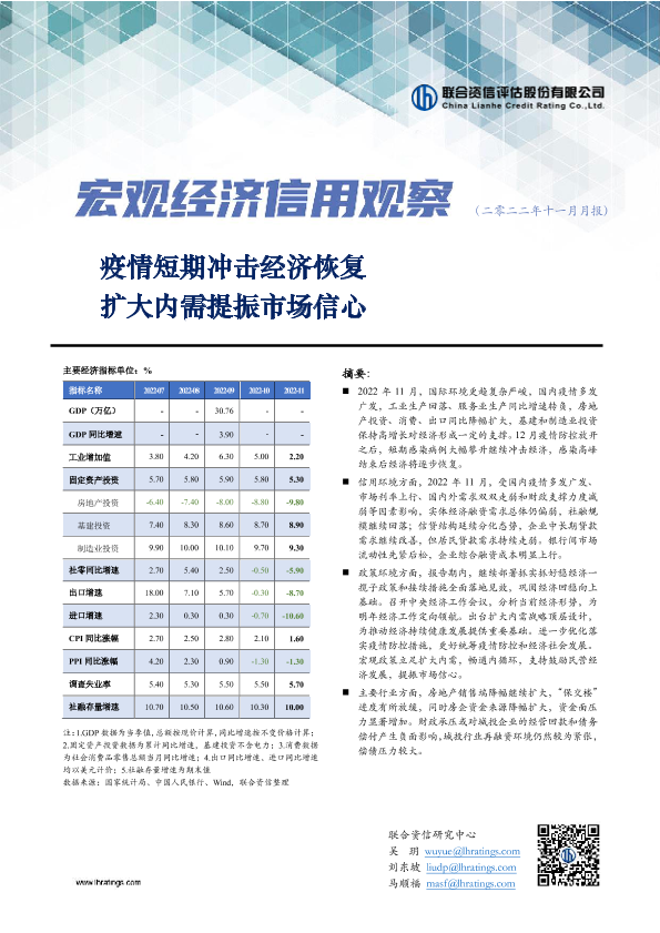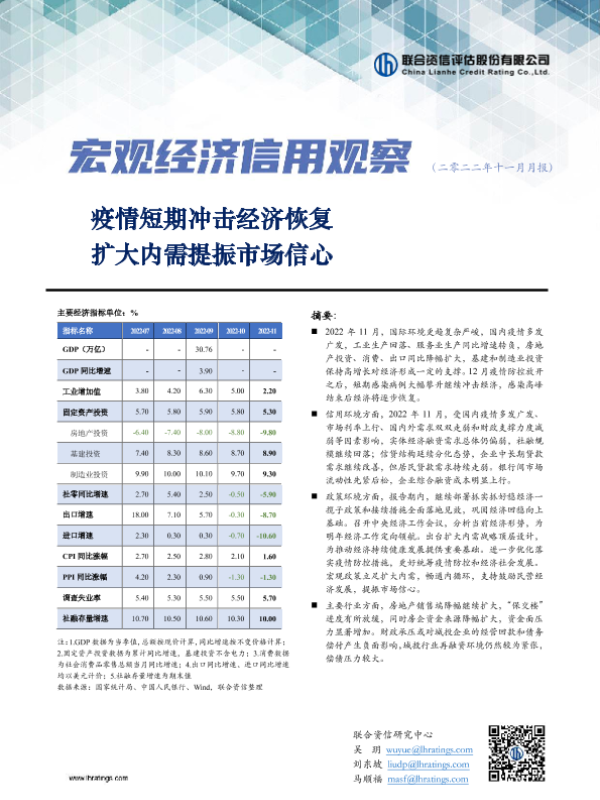 【联合资信】【202211】宏观经济信用观察(二零二二年十一月月报):疫情短期冲击经济恢复 扩大内需提振市场信心-15页