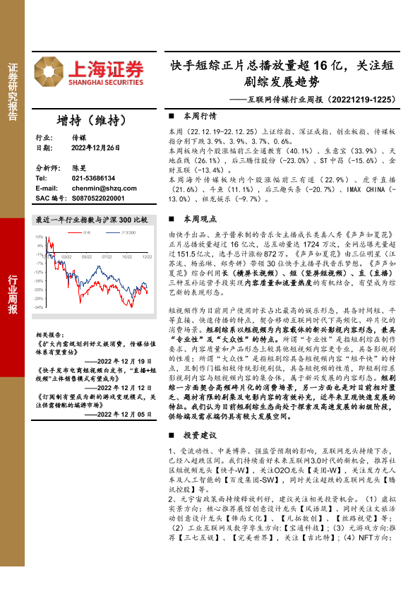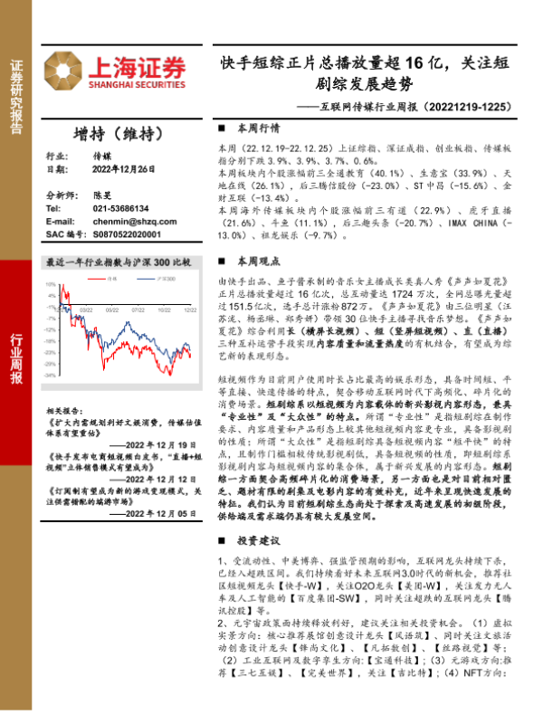 【上海证券】【20221226】互联网传媒行业周报:快手短综正片总播放量超16亿,关注短剧综发展趋势-21页