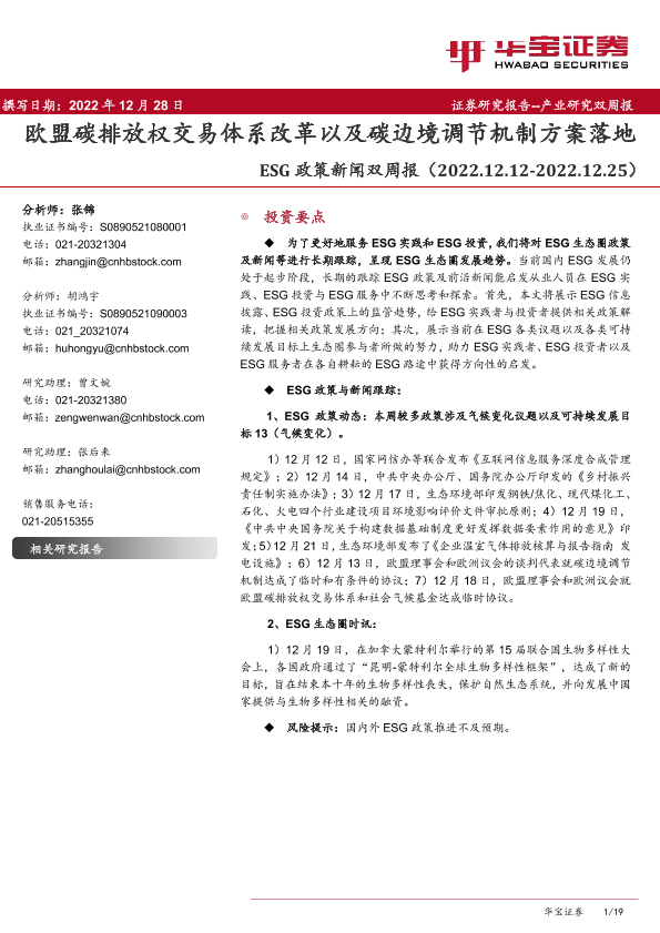 【华宝证券】【20221228】环保行业ESG政策新闻双周报:欧盟碳排放权交易体系改革以及碳边境调节机制方案落地-19页