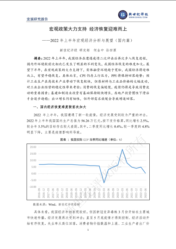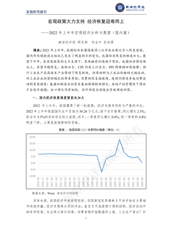 【新世纪评级】【20220630】宏观政策大力支持 经济恢复迎难而上——2022年上半年宏观经济分析与展望(国内篇)-16页