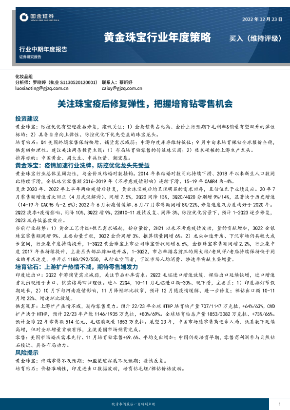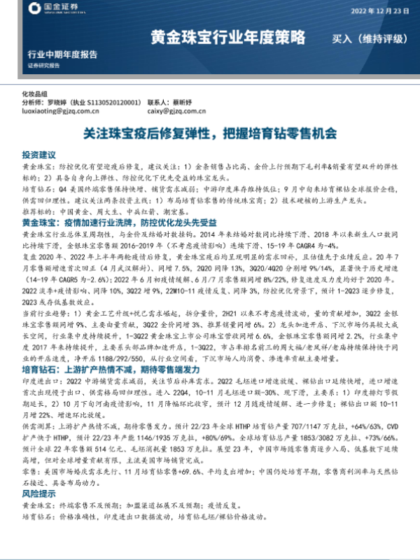 【国金证券】【20221223】黄金珠宝行业年度策略:关注珠宝疫后修复弹性,把握培育钻零售机会-28页