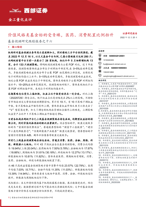 【西部证券】【20221225】基金投顾研究跟踪报告之十六:价值风格类基金标的受青睐,医药、消费配置比例抬升-17页