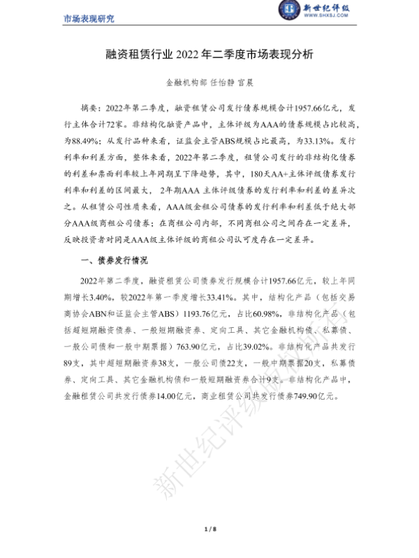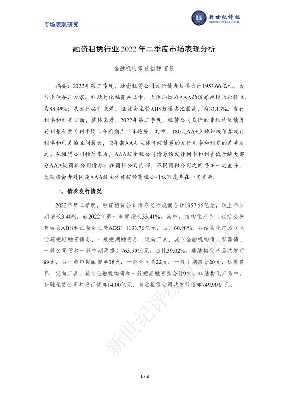 【新世纪评级】【20220630】融资租赁行业2022年二季度市场表现分析-8页