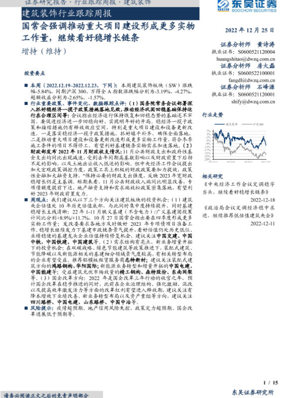【东吴证券】【20221225】建筑装饰行业跟踪周报:国常会强调推动重大项目建设形成更多实物工作量,继续看好稳增长链条-15页